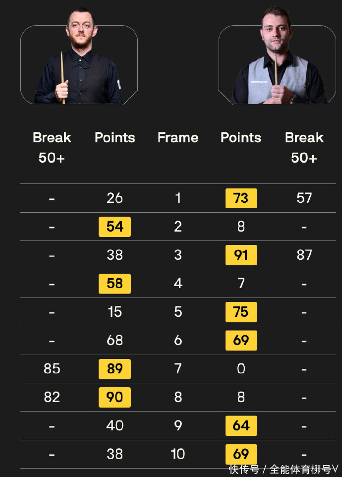 第六局,墨菲进一步擢升蹙迫手感,他轰出单杆102分,102-0零封佩奇,3-3救济第二个赛点,两边回到同扫数跑线。决胜局,佩奇再度发力,他打出单杆53分,78-11拒却逆转,总比分4-3将墨菲淘汰出局。