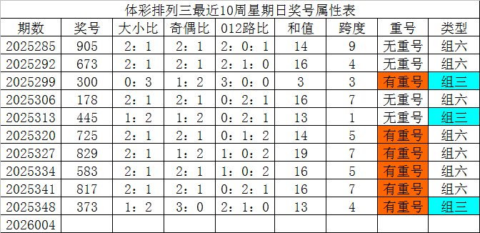 体彩摆列三最近10周日曜日奖号分裂为:905、673、300、178、445、725、829、583、817、373,各奖号属性详见下表: