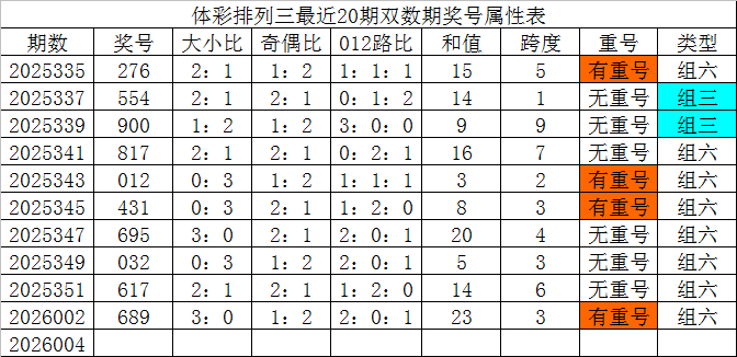 体彩摆列三最近20期双数期奖号分裂为:276、554、900、817、012、431、695、032、617、689,各期奖号疑望属性下表: